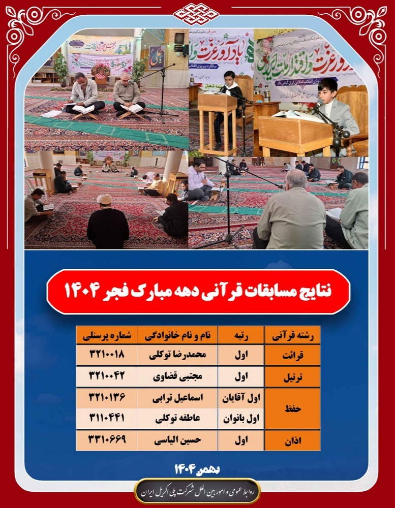 به اطلاع همکاران محترم میرساند، نتایج مسابقات قرآنی دهه مبارک فجر که در روز دوشنبه 1404/11/20 در مسجد شرکت برگزار شد، اعلام میگردد.